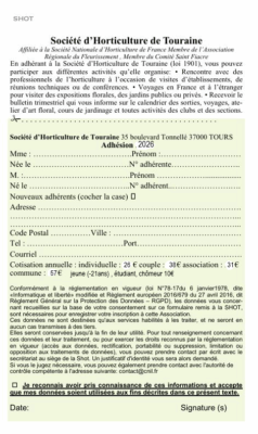Société d’Horticulture de Touraine Cotisation annuelle 2026 : individuelle 26€ / couple 38€ / association 31€ / commune 57€ / jeune (-21ans) , étudiant, chômeur 10€ Si vous souhaitez adhérer à l’association, il suffit de cliquer sur le lien ci-dessous.C’est l’association « Hello Asso » qui gère les paiements. Une participation facultative à cette association vous sera proposée (5€ ou plus), C’est à vous de choisir de l’aider .Cliquez sur ce lien pour Hello Asso Vous pouvez aussi télécharger et envoyer par voie postale (Société d’Horticulture de Touraine, 35 Bd Tonnellé -37000 Tours) la fiche accompagnée de votre règlement .