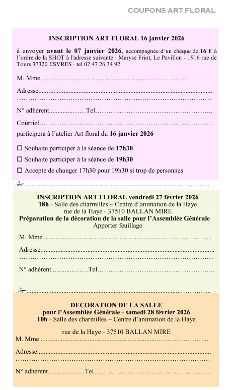 Le 3ème vendredi de chaque mois, la SHOT propose un cours d’art floral à 17h30 et 19h30 à la salle d’activités de la Gloriette à Tours.