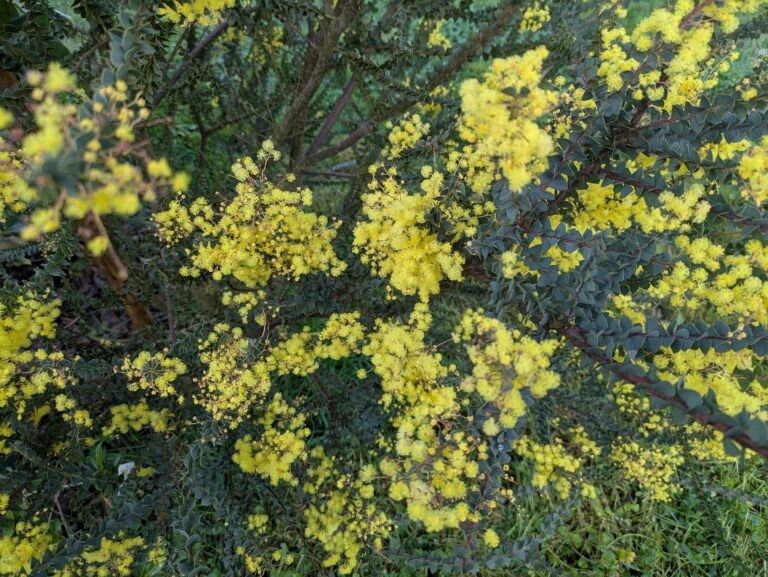 Examinons aussi cette grande extravagante, le Mimosa des fleuristes (Acacia dealbata) ou mimosa d’hiver, tellement prolifique en fleurs que ses branches finissent par craquer. Il se fait remarquer par une odeur quasiment entêtante ! Il peut même devenir invasif dans certaines régions !